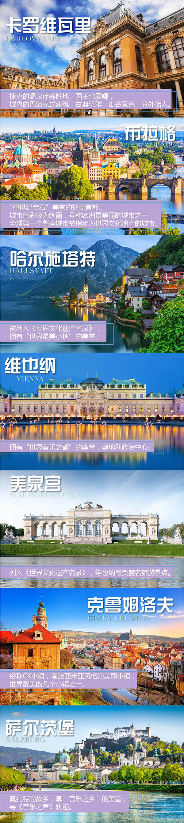 捷克:捷克的溫泉療養勝地卡羅維瓦里,城內的巴洛克式建筑,古典優雅;山谷景色,分外怡人。捷克首都布拉格,全球第一個整座城市被指定為世界文化遺產的城市。